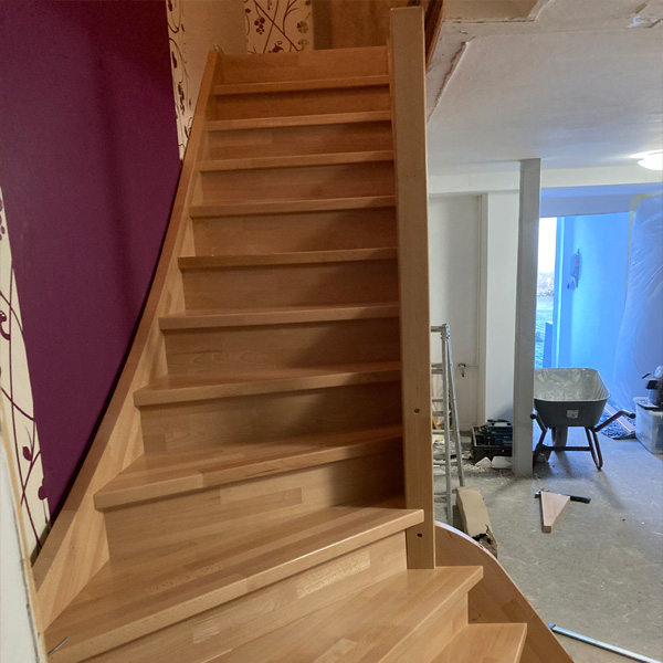 Viertelgewendelte Treppe Buche Bild vergrößern Mehr Bilder Details Viertelgewendelte Treppe aus 40 mm Buche-Massivholz Geländer: 20mm Edelstahlstäbe